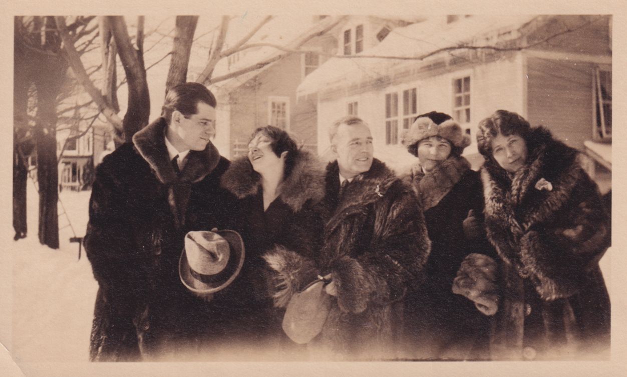Black and white photograph of three women and two men, all in fur coats, standing together in front of a line of houses.