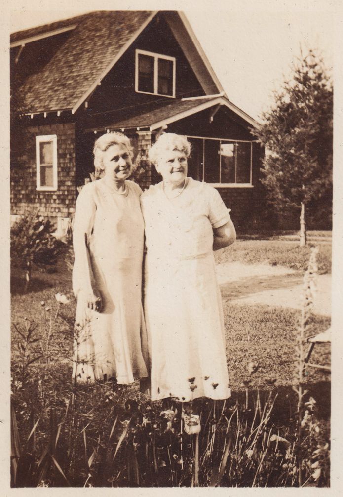 Black-and-White photograph of Clara A. White (Amy Jones' mother), and Abbie Jane Jones (Blair Jones' mother) standing outdoors. An unidentified house can be seen behind them.