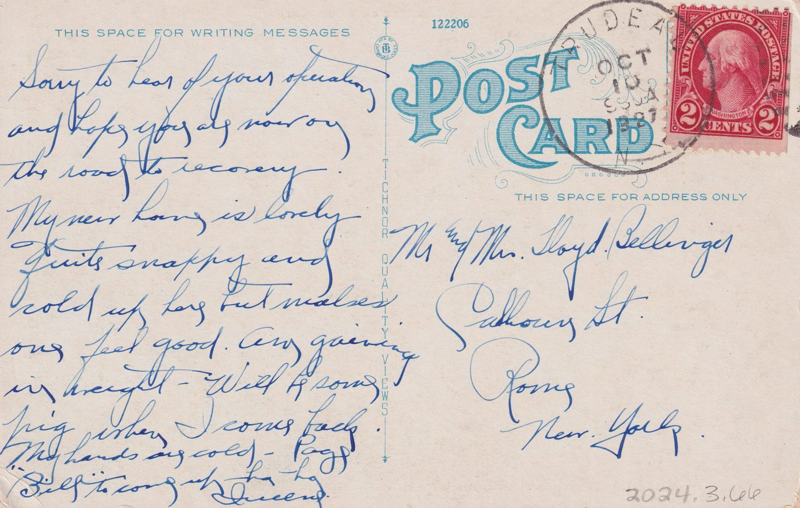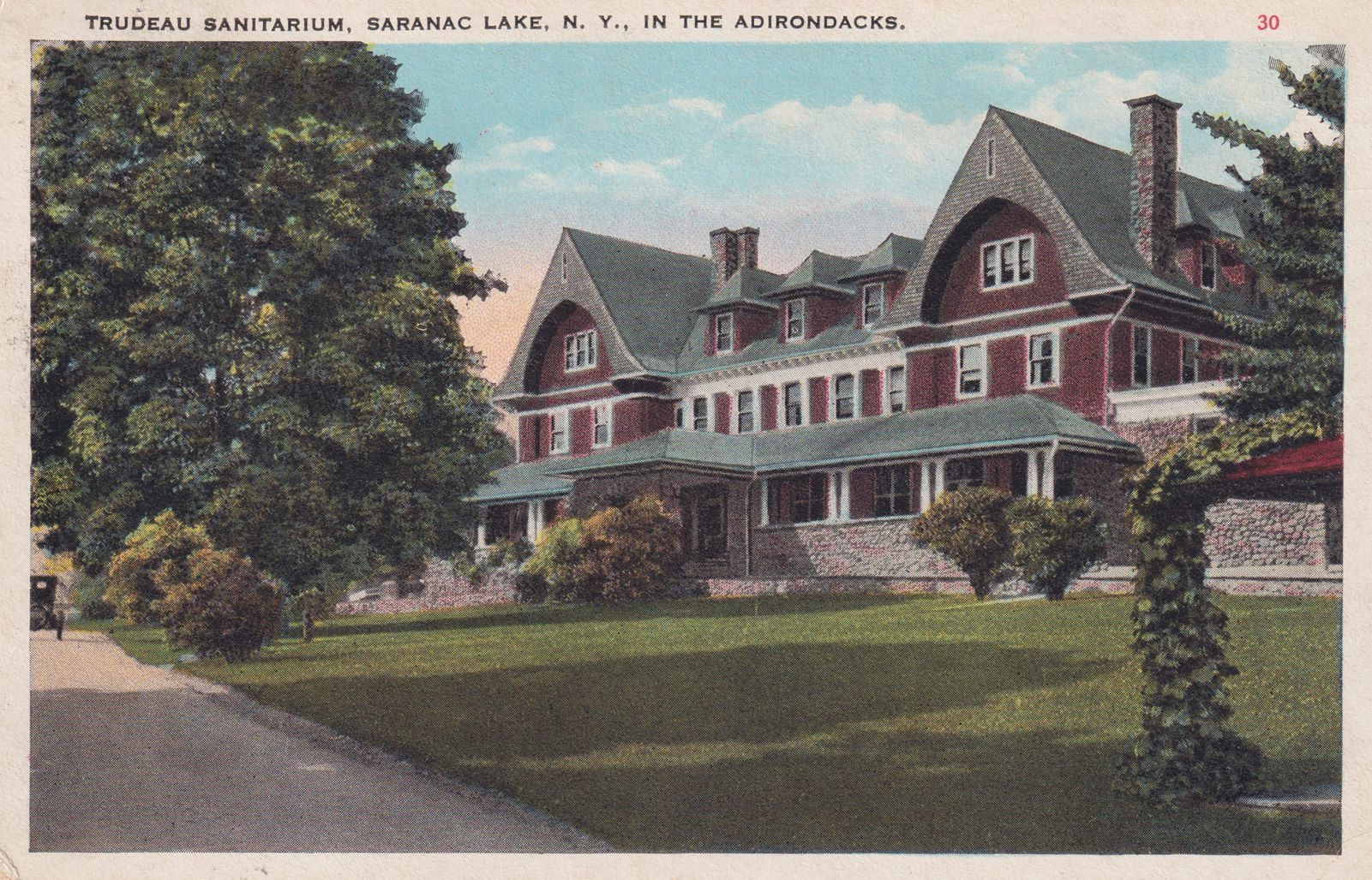 Color postcard showing the main building at Trudeau Sanatorium. Printed caption on front reads, "Trudeau Sanitarium, Saranac Lake, N.Y., in the Adirondacks." Printed by Tichnor Quality Views. Used, divided back, white border, postmarked Trudeau, NY, October 10, 1927. Handwritten message on back reads, "Sorry to hear of your operation and hope you are now on the road to recovery. My new home is lovely. Quite snappy and cold up here but makes one feel good. Am gaining in weight. Will be some pig when I come back. My hands are cold. [?] "Bill" to come up - ha ha. [?]." Mailed to Mr. and Mrs. Lloyd Bellinger, Calhoun St., Rome, NY.Subject Place