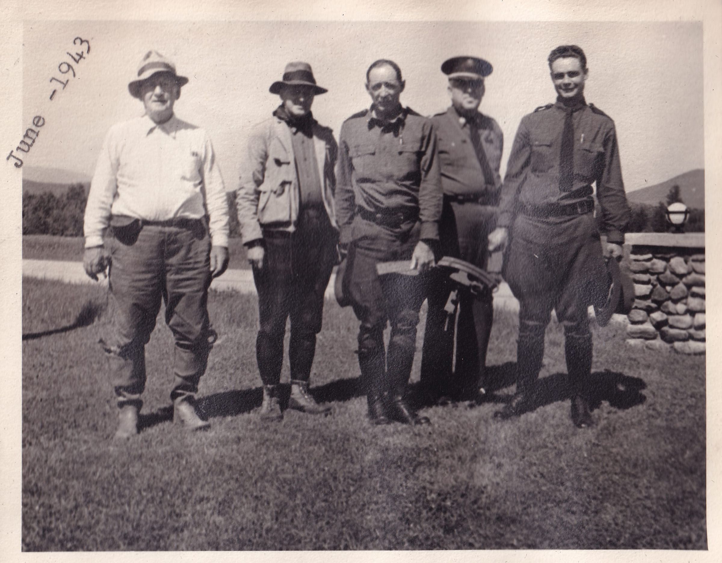 Black-and-White photograph of five men standing in a row. Three of the men are wearing game warden uniforms, and two of them are holding a metal animal trap between them. Typewritten on top left corner is "June - 1943."