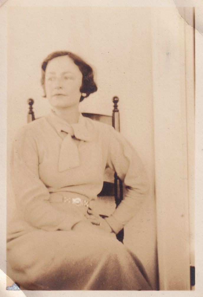 Black-and-White photograph of Amy Jones. She is seated with her face turned away from the camera. Part of album 2024.21.1, kept by Amy Jones and David Blair Jones c. 1930-1934.