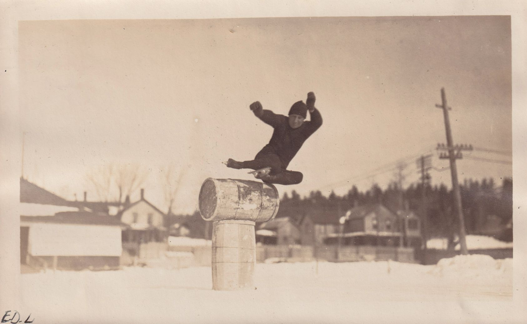 Black-and-white photograph of Ed Lamy in skating gear, jumping over one barrel stacked sideways on another that is upright on the ice. "ED.L" is written in ink in the bottom left corner of the photograph.