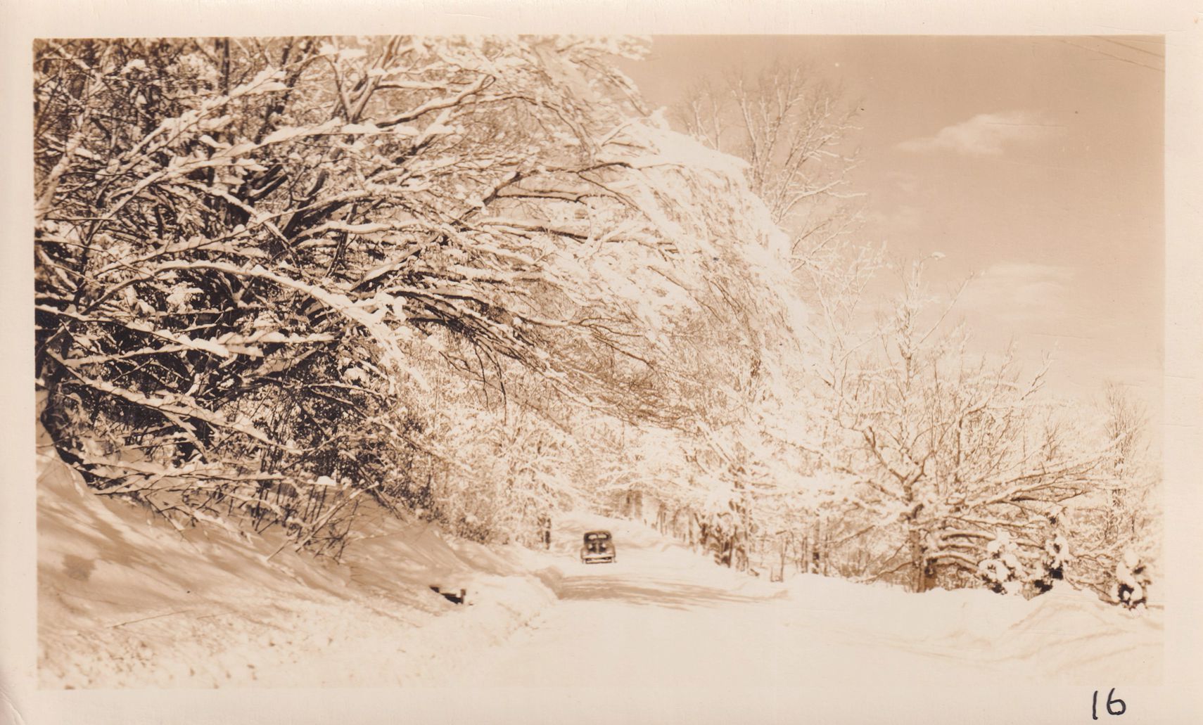 Black-and-White photograph of a snowy road lined with trees. A car can be seen driving toward the photographer. "16" is written in pen in the bottom right corner. The photograph was likely printed by Kollecker's Kodak and Gift Shop.