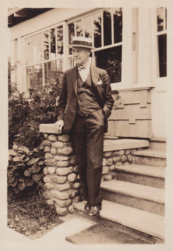 Black-and-White photograph William Hope, the law partner of C. A. White. He is wearing a suit and boater hat. He is standing on the steps of the Jones Family's second home in Saranac Lake, possibly 453 Lake Street.