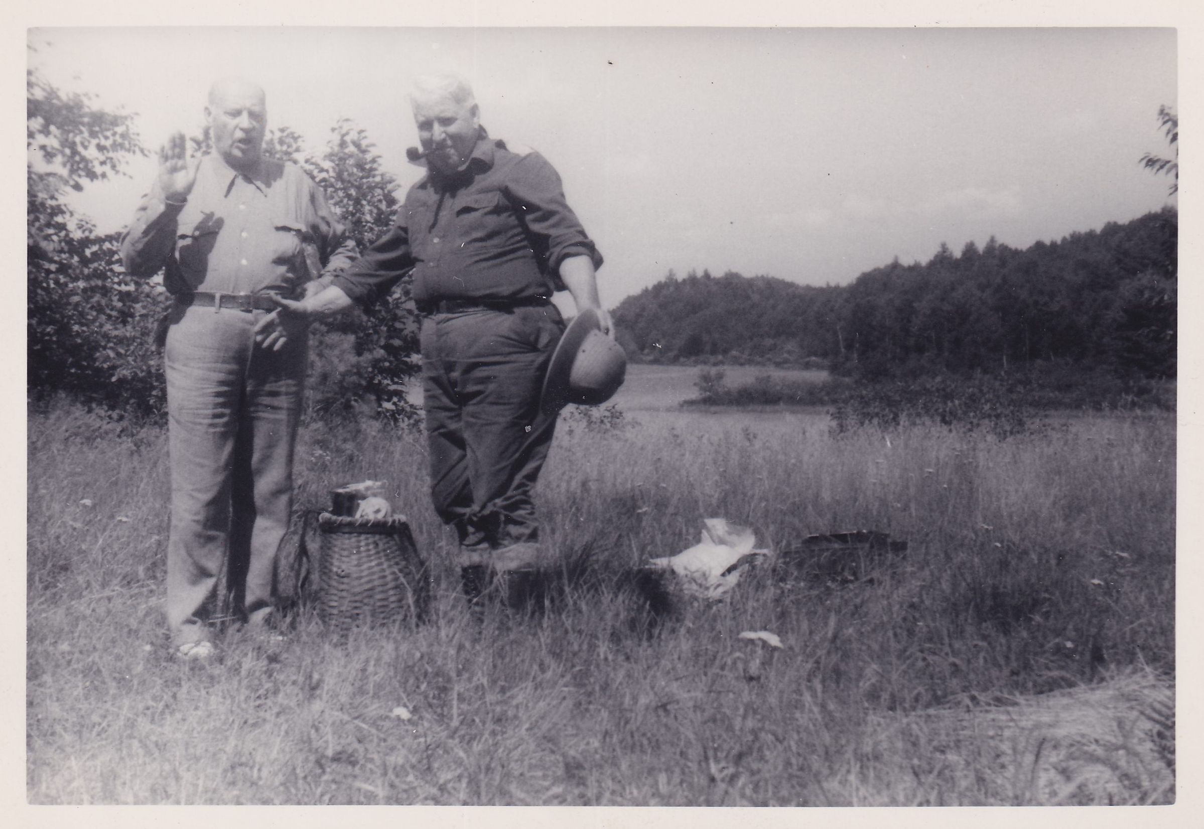 Black-and-White photograph of two men standing in a field. There is a pack basket at their feet. Ray Burmaster is at right, and the man at left may be Dr. Charles Trembley.