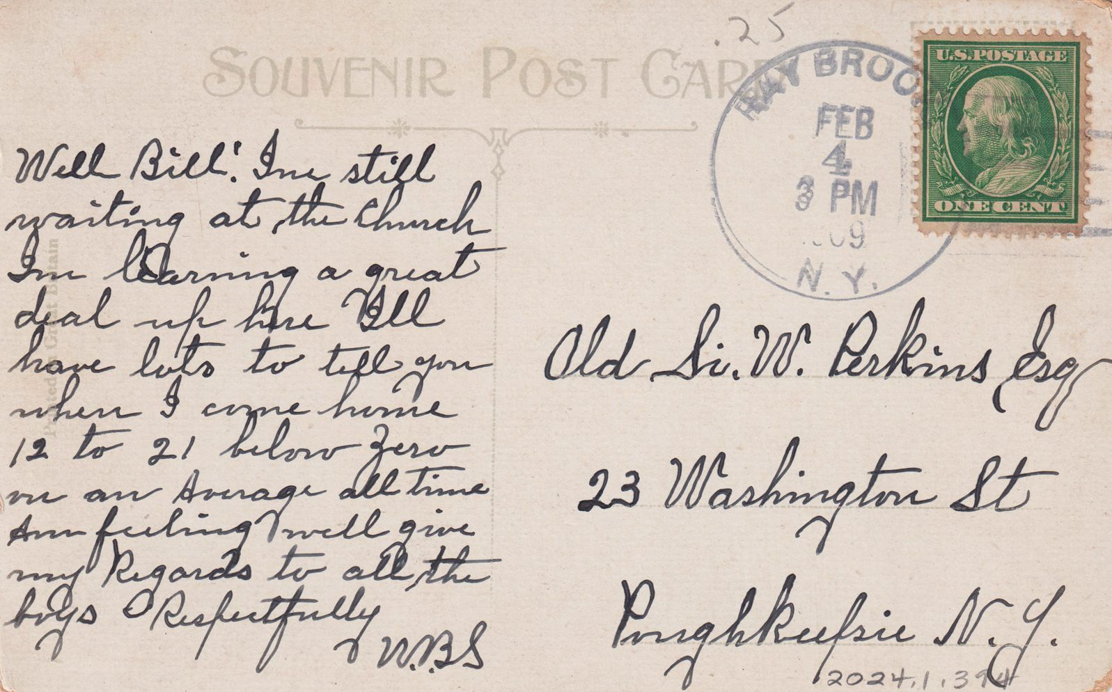 Postcard with an image of the First Presbyterian Church of Saranac Lake. The postcard is addressed to W. Perkins.