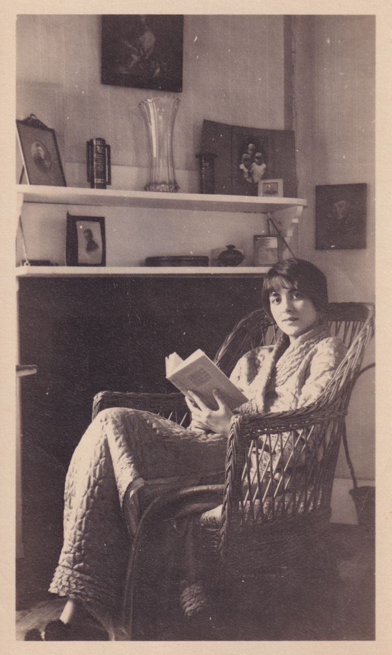 Black and white photograph of a woman wearing a robe sitting in a wicker chair. She is holding a book. This item is not fully cataloged but has been uploaded so the image is publicly available; if you would like us to prioritize cataloging this item, please contact the HSL Collections team.