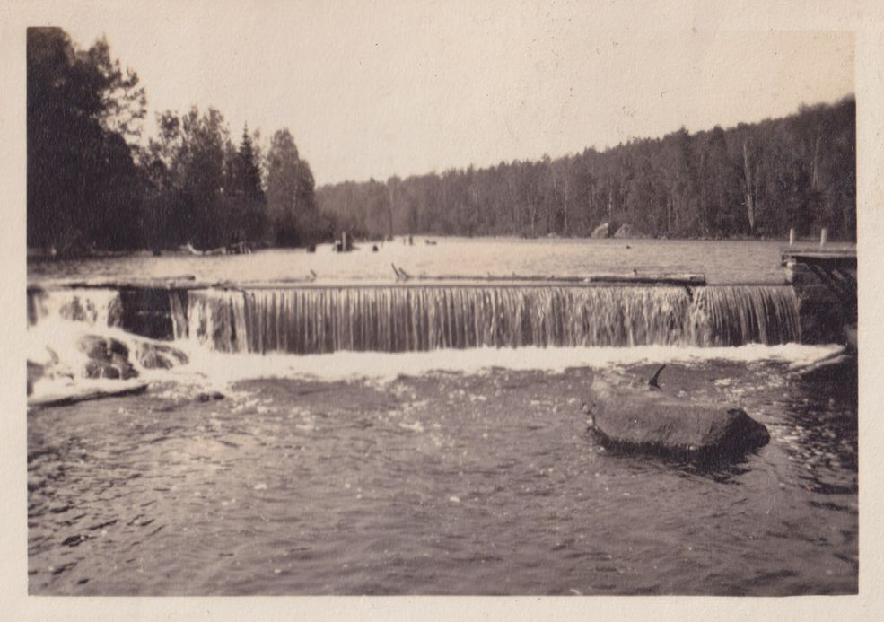 Black-and-white photograph of a river running over a small man made ledge in its path. There are tree lines on either side of the river.