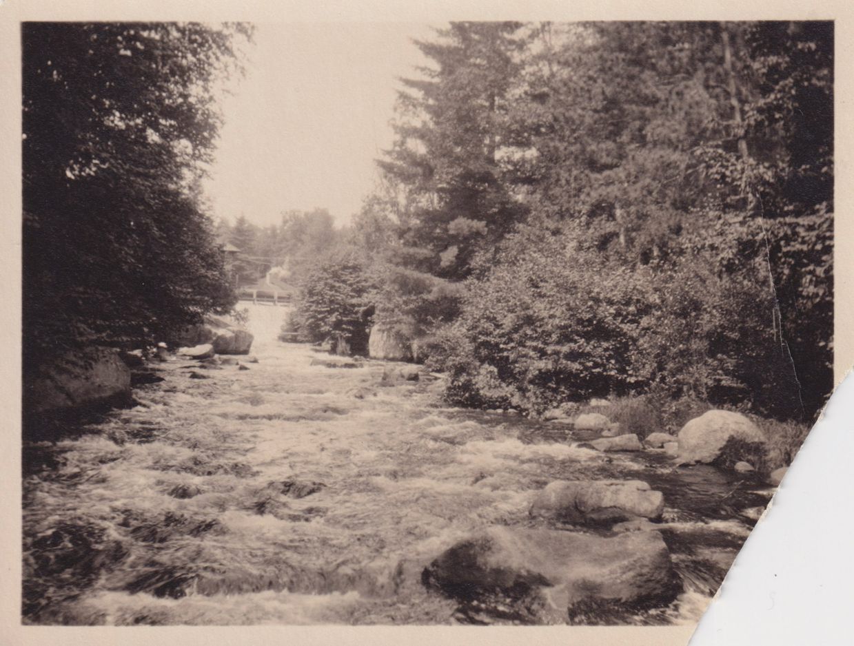 Black-and-White photograph looking up the Saranac River toward Bartlett Carry Club. Handwritten note on reverse reads, "1925."