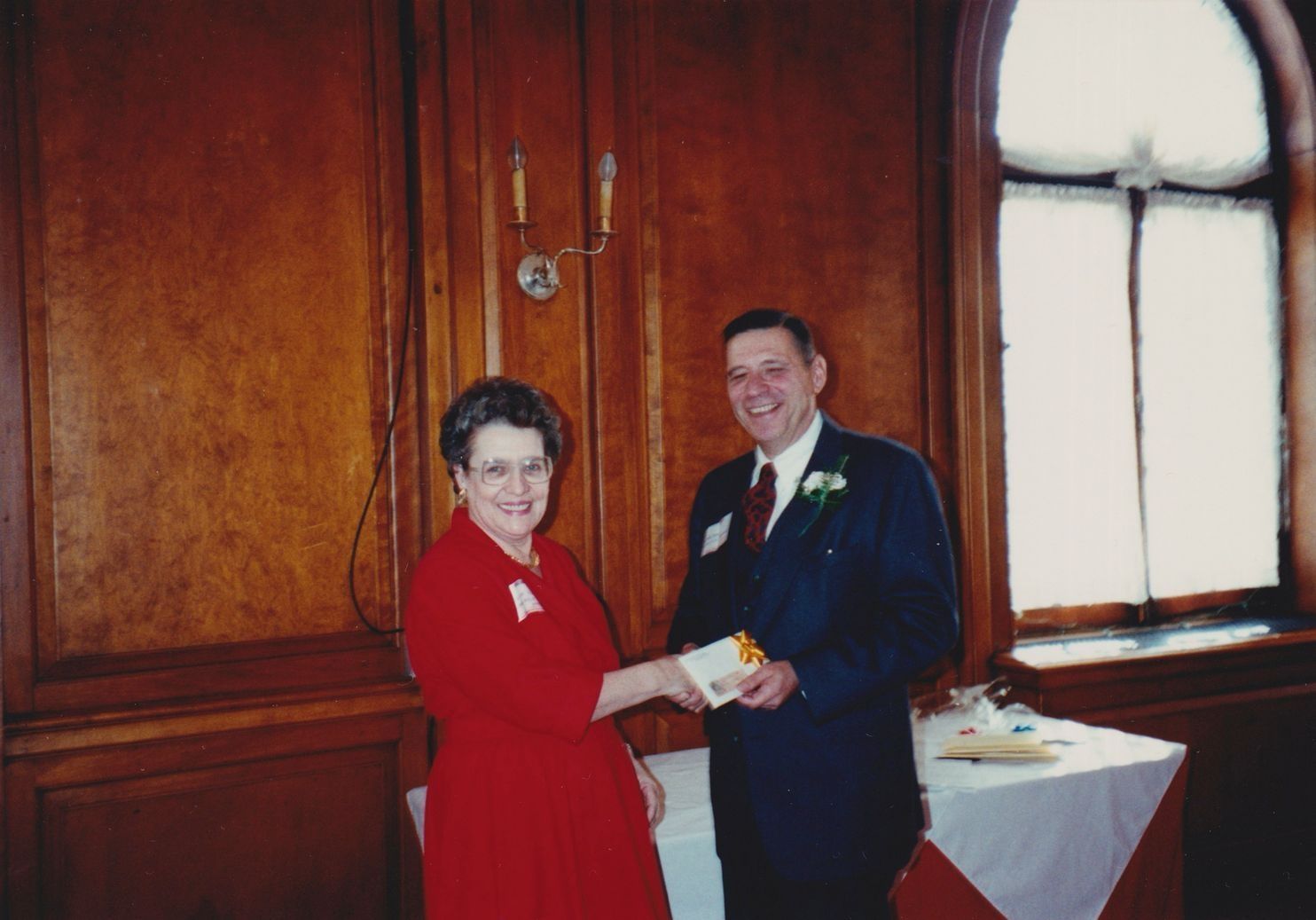 Color photograph of a man and woman shaking hands in a large room with wooden walls. The woman is wearing a red dress and the man has on a business suit. This photograph is from an album of photographs taken at the American Management Association.