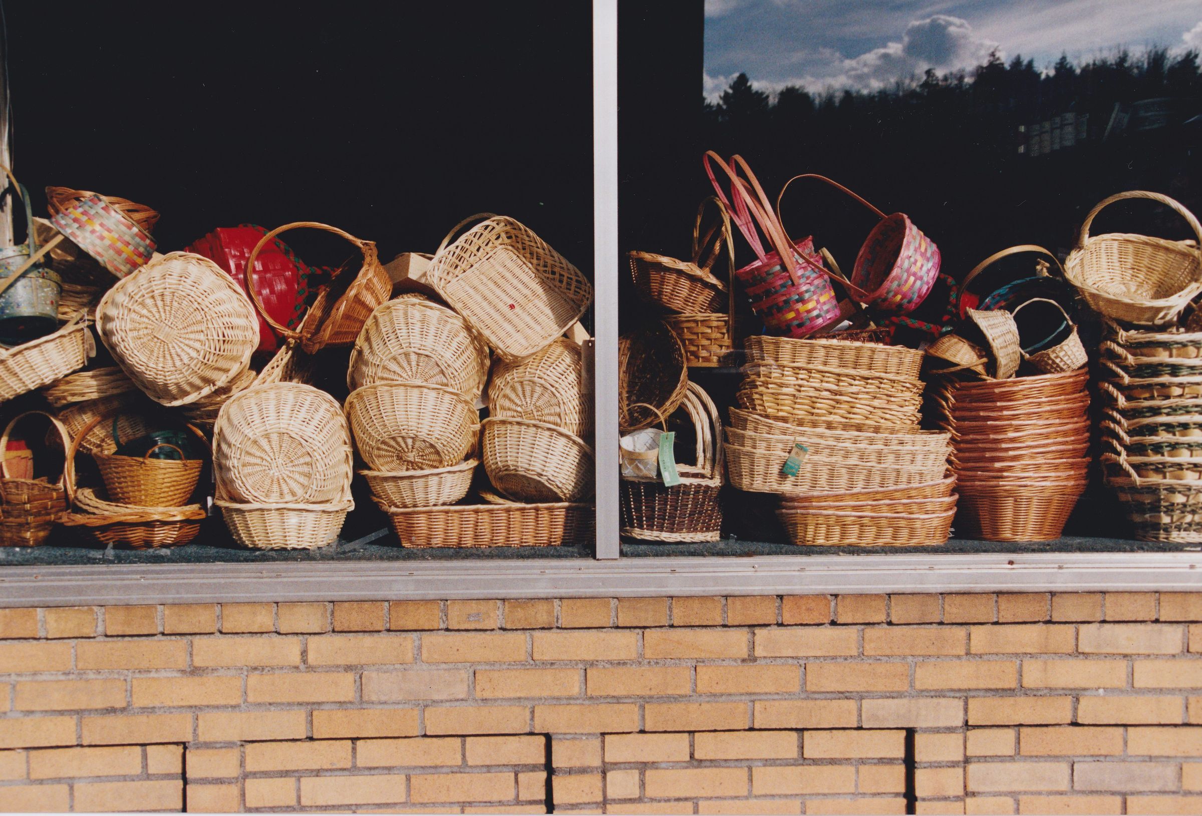 Color photograph of an assortment of baskets in the window of the Oxford Market. Photograph taken by Mary Lou Hanpeter Banks as part of her Soul Proprietor exhibition.