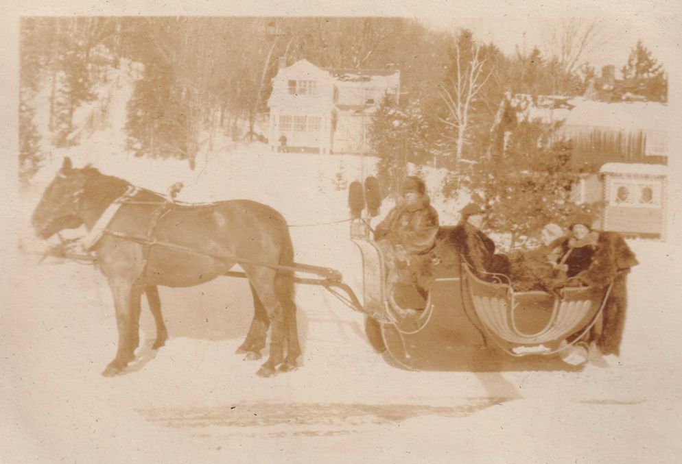Black-and-White photograph of an ornate horse-drawn passenger sleigh on the ice. The sleigh is lined with fur and carries three passengers and a driver. The house at 114 Park Avenue [now 67 Old Military Road] and Katherine McClellan's studio are visible in the background.