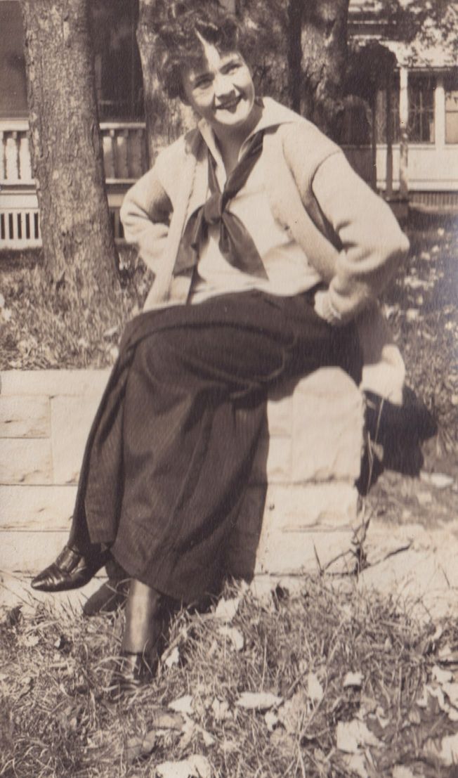 Black-and-white photograph of a woman sitting on a stone wall in front of a cure cottage. There are trees in the yard behind her.