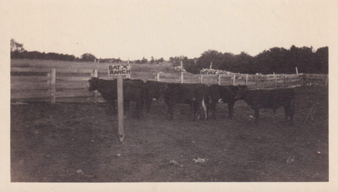 Black-and-White photograph of cows standing along a fence. A small sign on a post reads, "Bat 'A' Ranch." Photograph was likely printed by Kollecker's Kodak and Gift Shop.