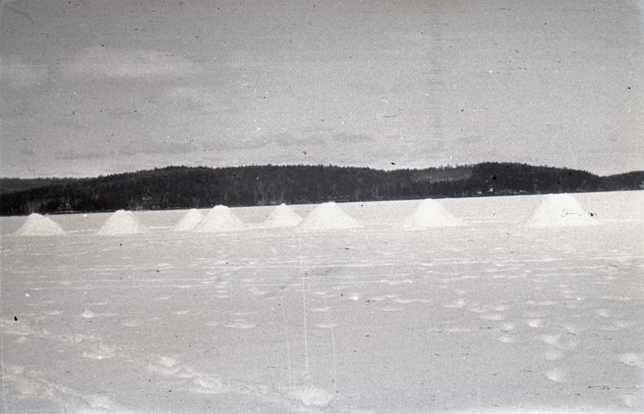 Negative of an ice-covered lake with mountains in the distance. There are multiple piles of snow on the ice. Most likely taken by Mary Ives Baldwin. This item is not fully cataloged but has been uploaded so the image is publicly available; if you would like us to prioritize cataloging this item, please contact the HSL Collections team.