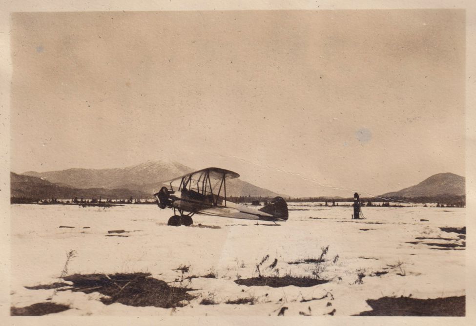 Black-and-White photograph of a biplane in a snowy field. There is a gas pump in the field.