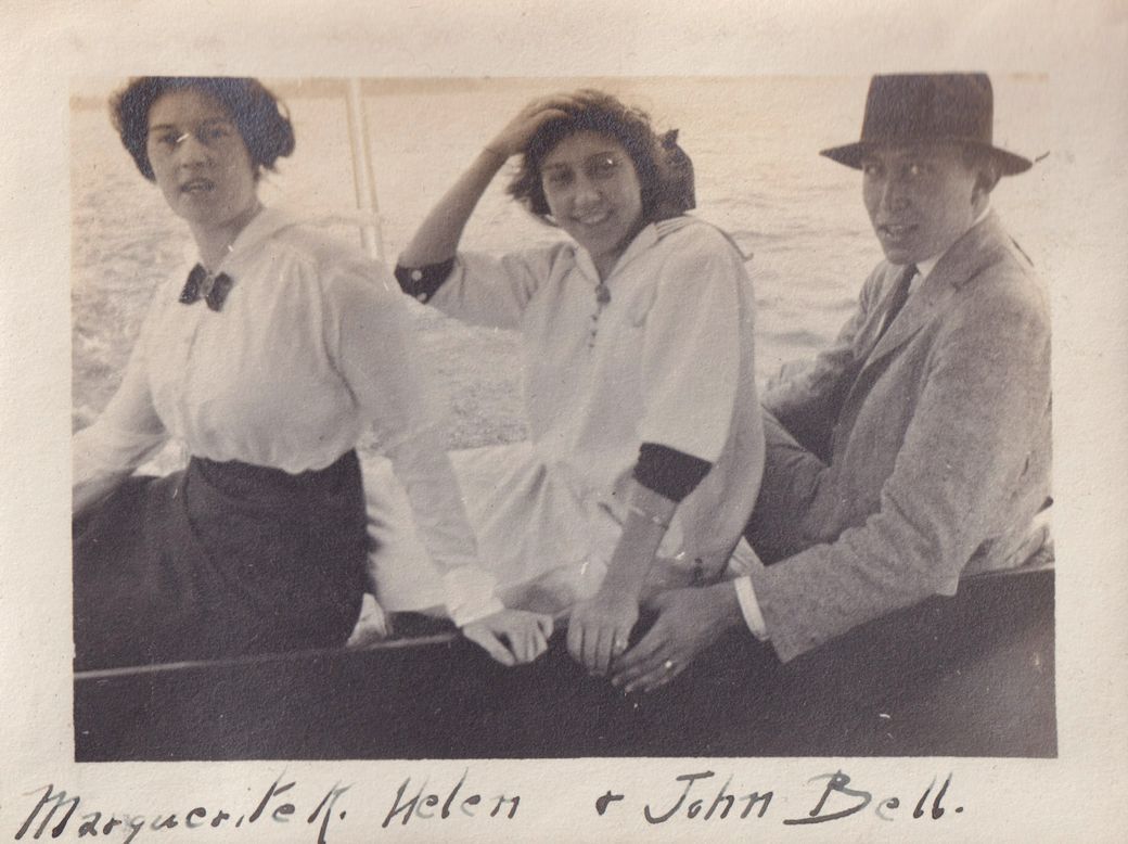 Black-and-white photograph of two women and one man sitting on what appears to be a bench seat on a boat or on a body of water's shore. "Marguerite K. Helen + John Bell" is written at the bottom of the photograph, identifying each person.