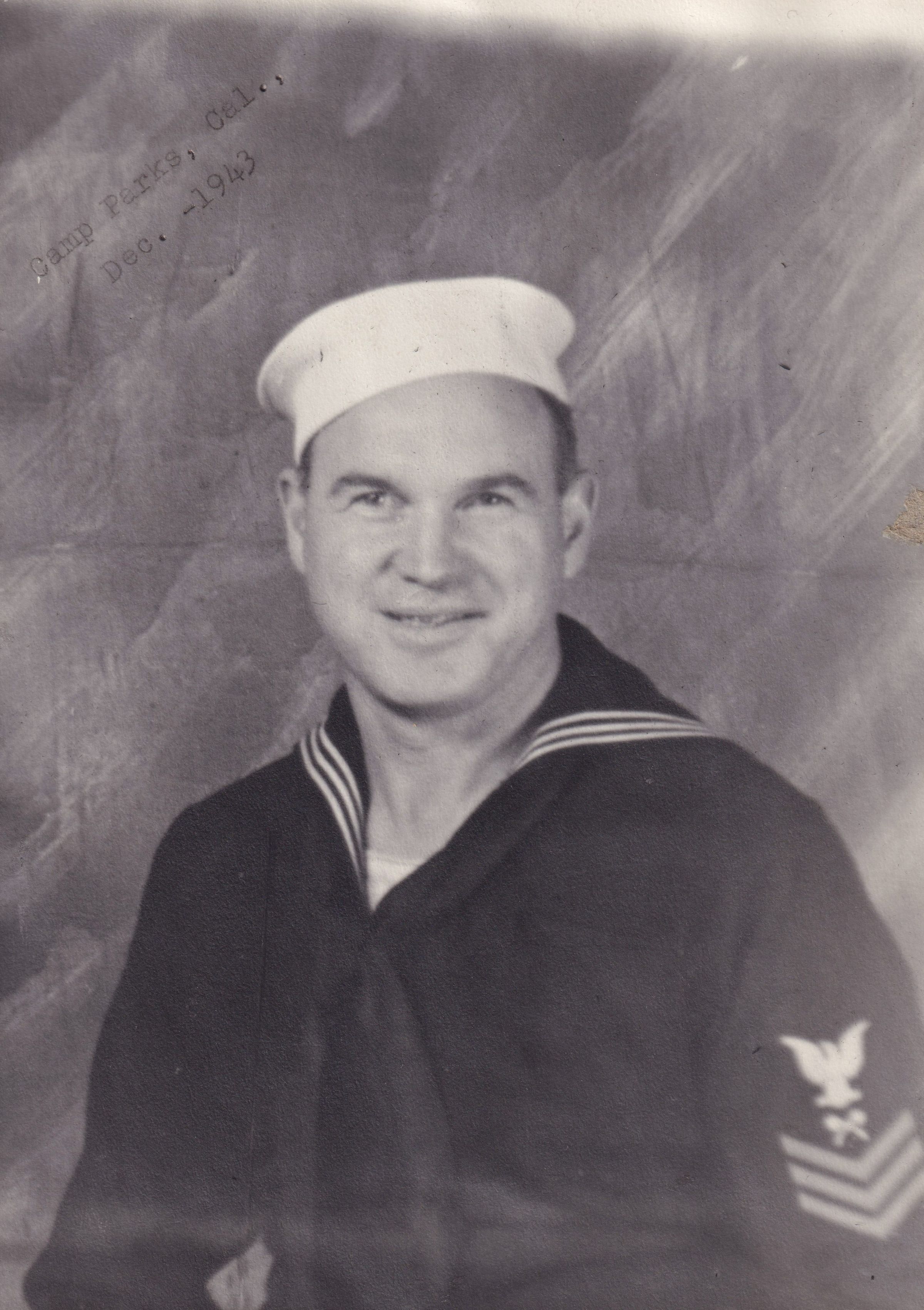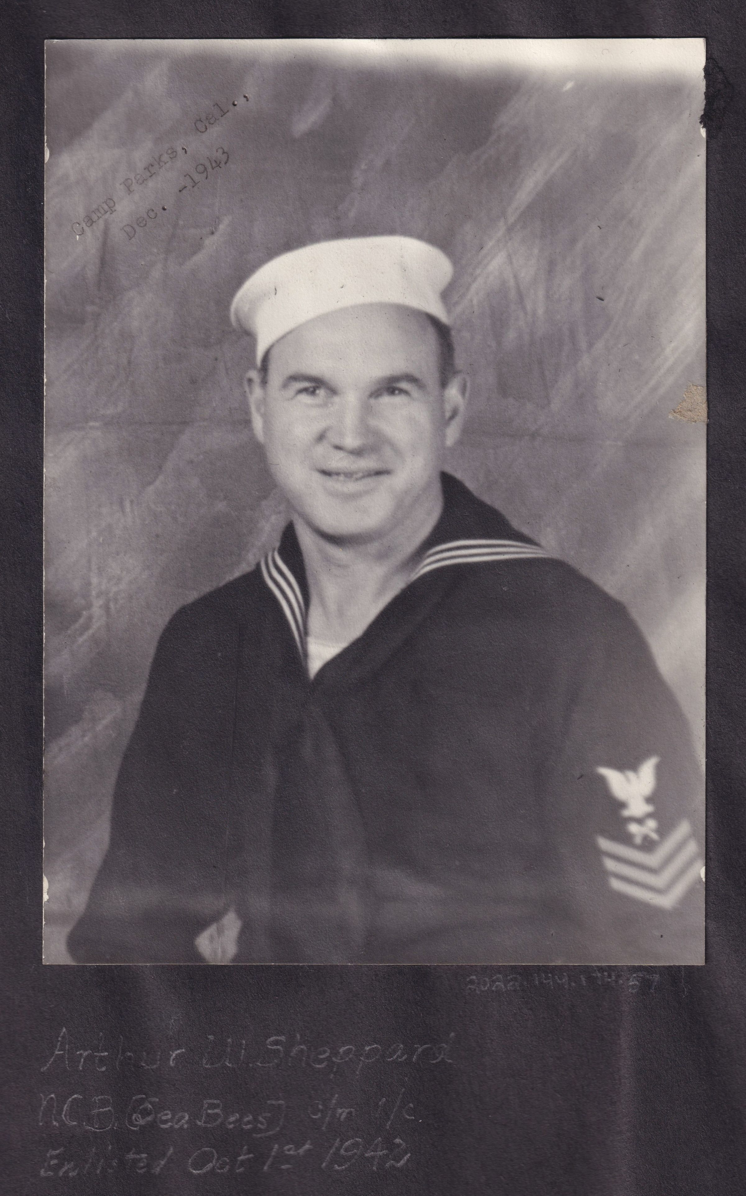 Black-and-White studio photograph of Arthur W. Sheppard in a naval uniform. Handwritten caption on page reads, "Arthur W. Sheppard, N.C.B. (Sea Bees), c/m 1/c. Enlisted Oct. 1st 1942." Typewritten caption on front of photograph reads, "Camp Parks, Cal., Dec. - 1943."Photograph Details