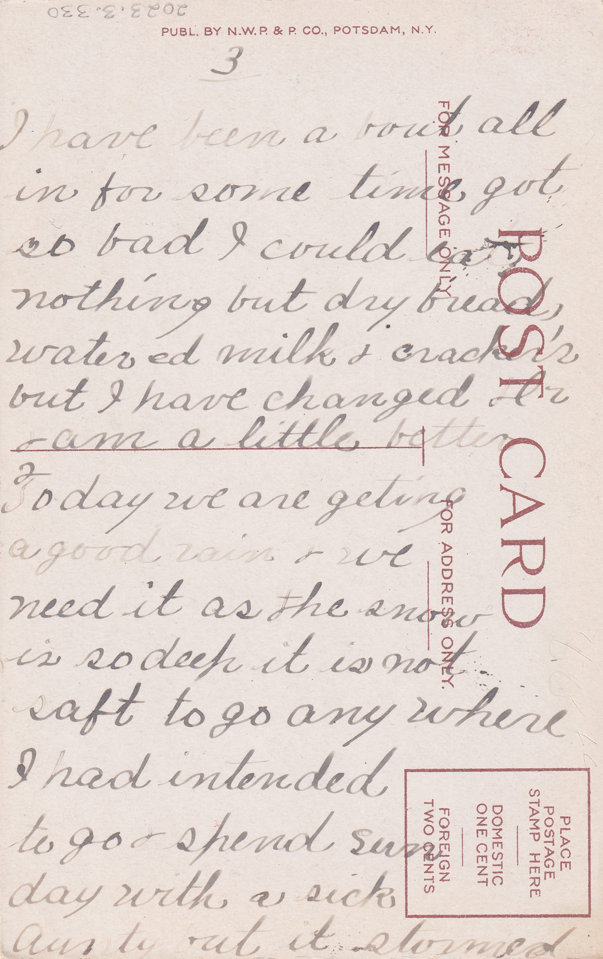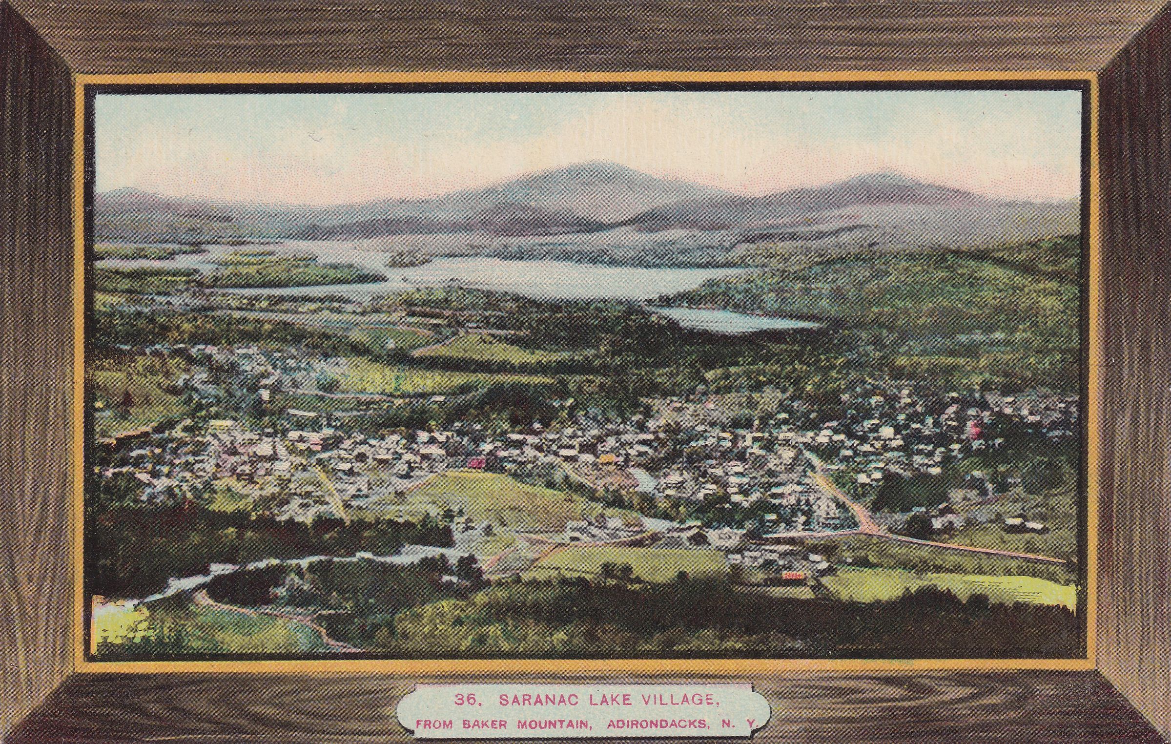 Color postcard showing the view of the village of Saranac Lake from Mt. Baker. Image is framed with a wooden "frame" border. Printed caption on front reads, "Saranac Lake Village, from Baker Mountain, Adirondacks, N. Y." Printed by N. W. P. & P. Co., Potsdam, NY. Used, divided back, not mailed. Handwritten message on back reads, "3. I have been about all in for some time got so bad I could eat nothing but dry bread, watered milk & crackers but I have changed Dr. & am a little better. 2. Today we are getting a good rain & we need it as the snow is so deep it is not saft [sic] to go any where I had intended to go & spend Sunday with a sick aunt but it stormed."Subject Place