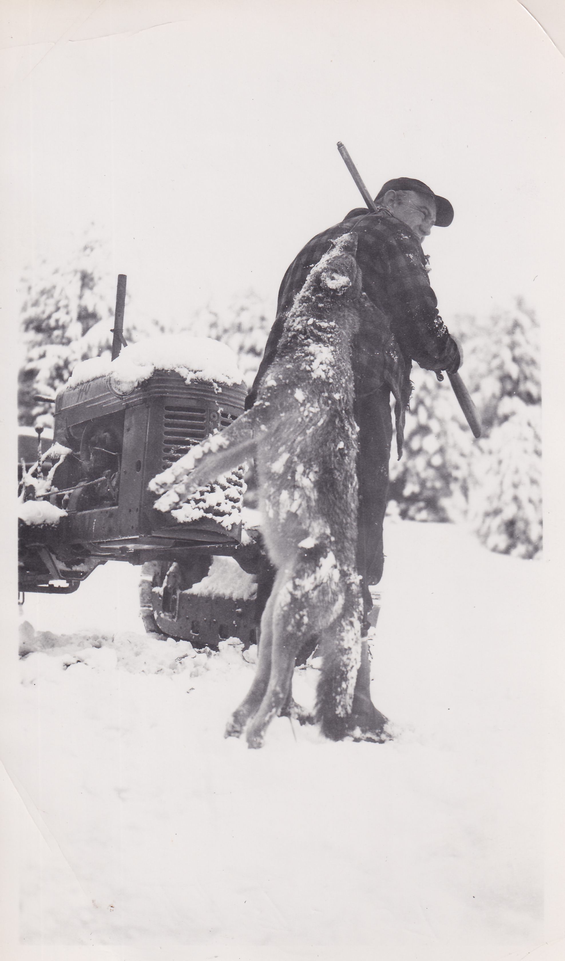 Black-and-White photograph of a man carrying a dead coyote over his shoulder and back. He is holding a rifle and standing next to a tractor in the snow.