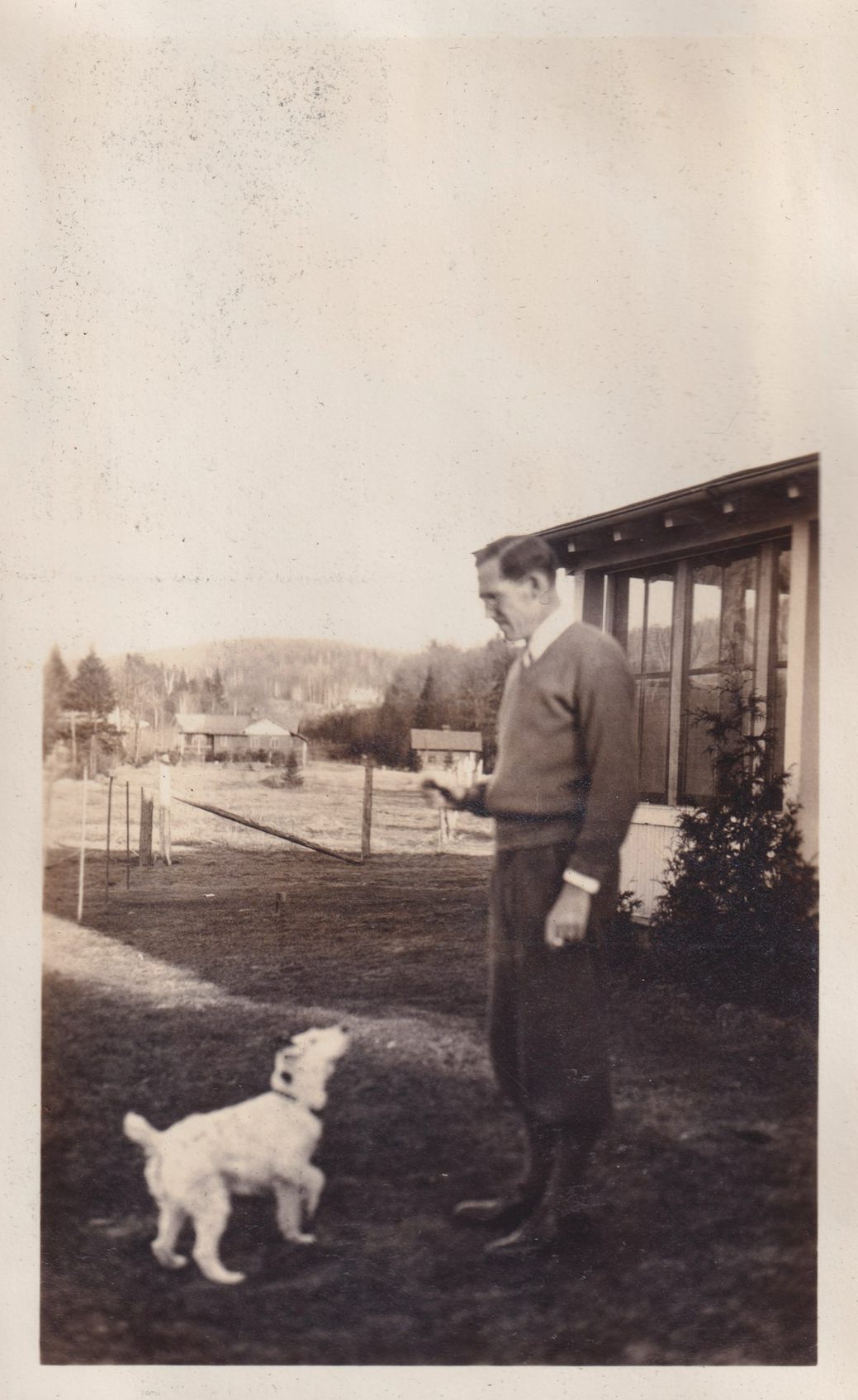 Black-and-White photograph of D. Blair Jones and Peggy the dog facing each other outside of the Danforth Cottage. Part of album 2024.21.1, kept by Amy Jones and David Blair Jones c. 1930-1934.