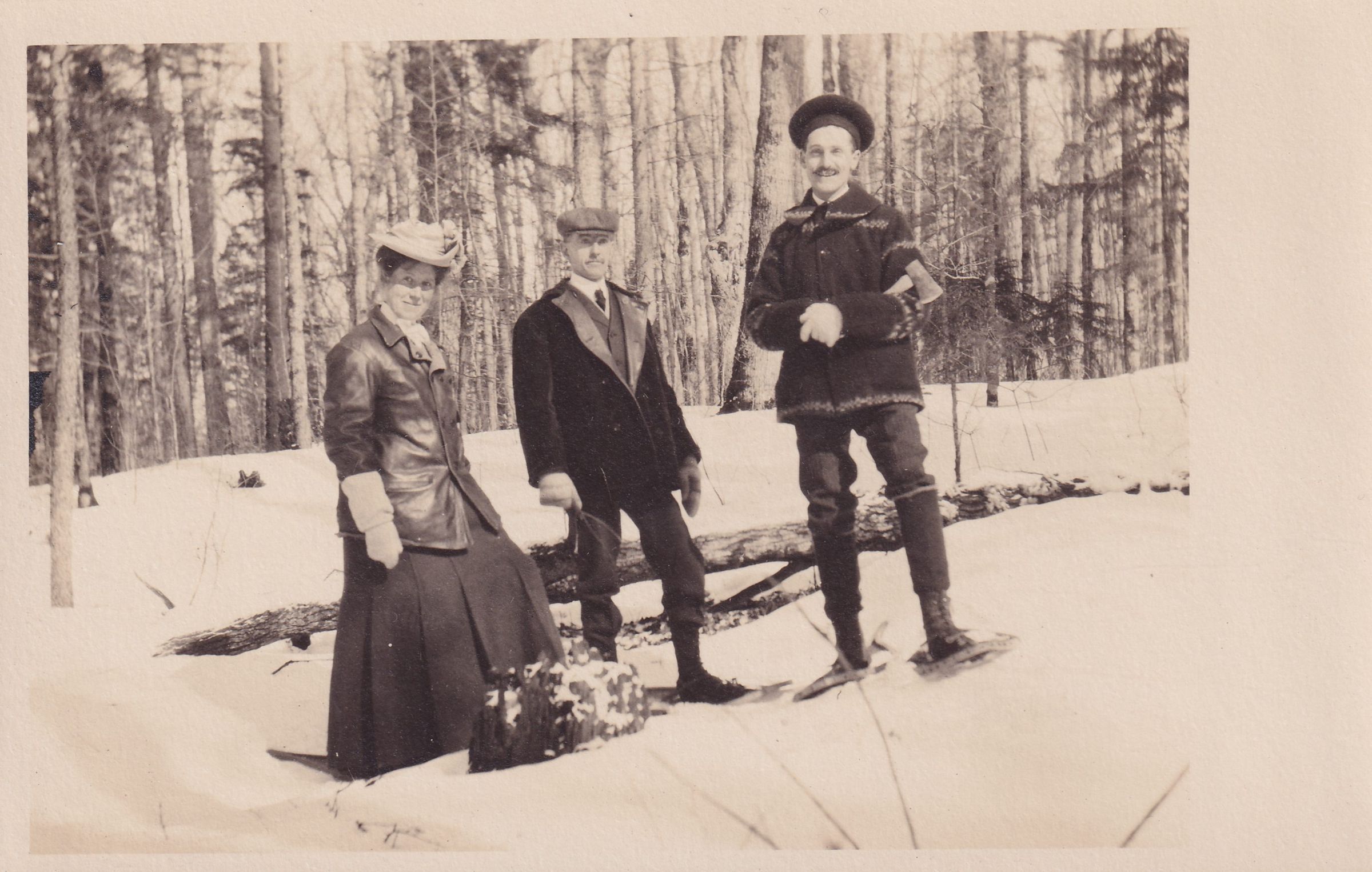 Black-and-White photograph postcard showing a group of people snowshoeing. Edward R. Baldwin is standing at right with a hatchet, Ernest H. Baldwin at center, and likely Mary I. Baldwin at right. Unused, divided back, white border.Subject Person/Organization