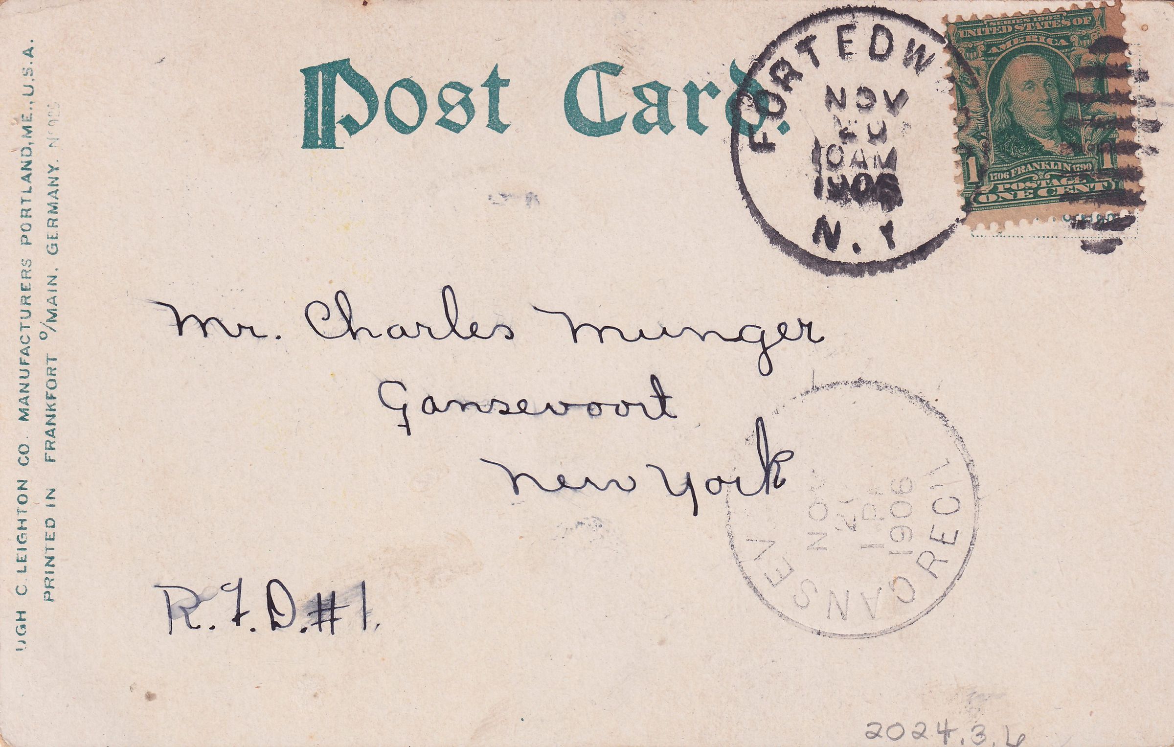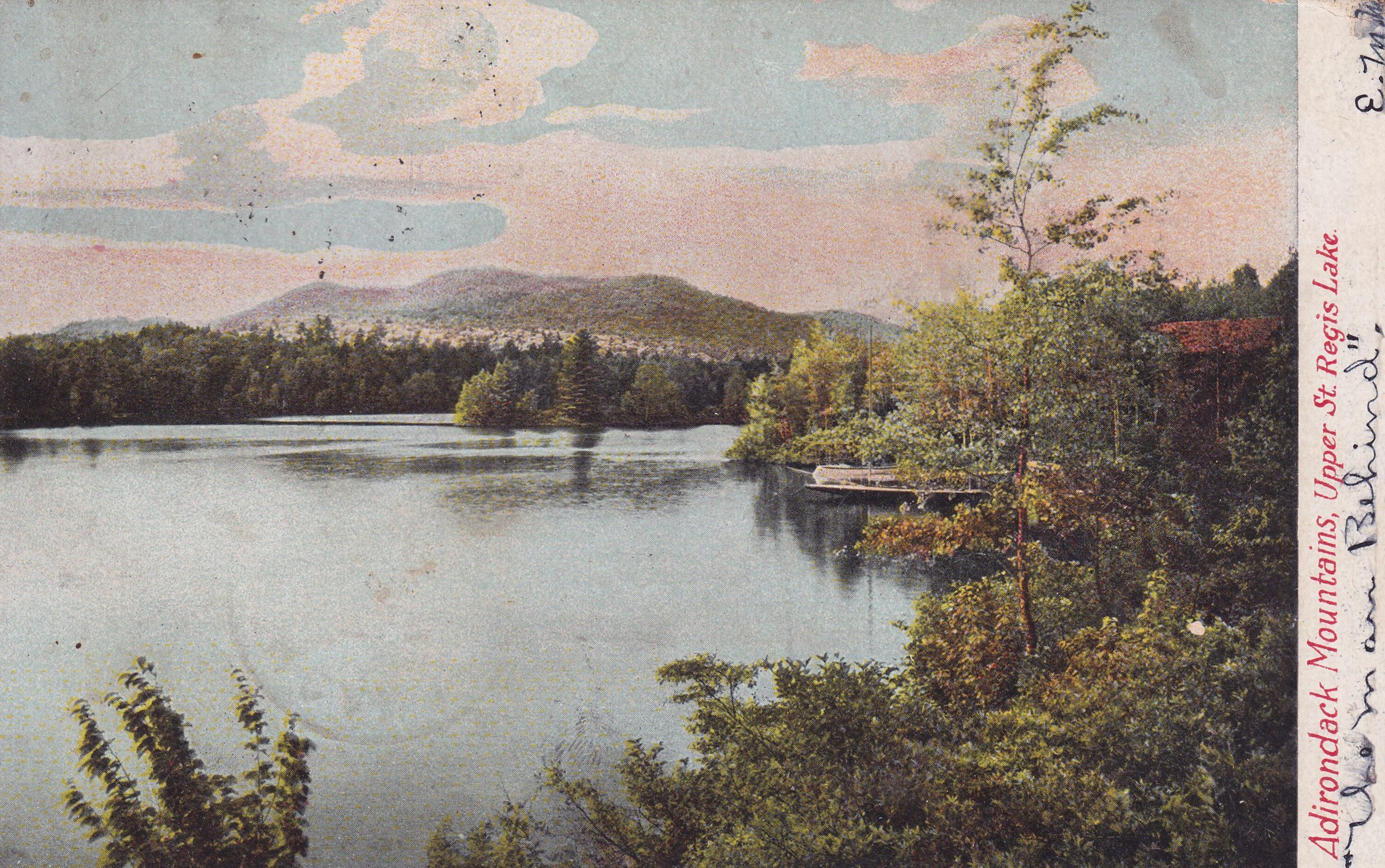 Color postcard showing a view of Upper St. Regis Lake. Printed caption on front reads, "Adirondack Mountains, Upper St. Regis Lake." Printed by Hugh C. Leighton Co., Portland, ME. Used, undivided back, white space for message at right, postmarked Fort Edward, NY, November 20, 1906. Handwritten message on front reads, "'The man Behind,' E. M. [?]." Mailed to Mr. Charles Munger, Gansevoort, New York, R. F. D. #1.Subject Place