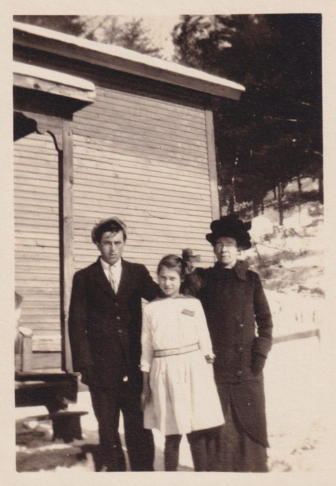 Black-and-White photograph of three unidentified people standing outside of a building. The photograph was likely printed by Kollecker's Kodak and Gift Shop.