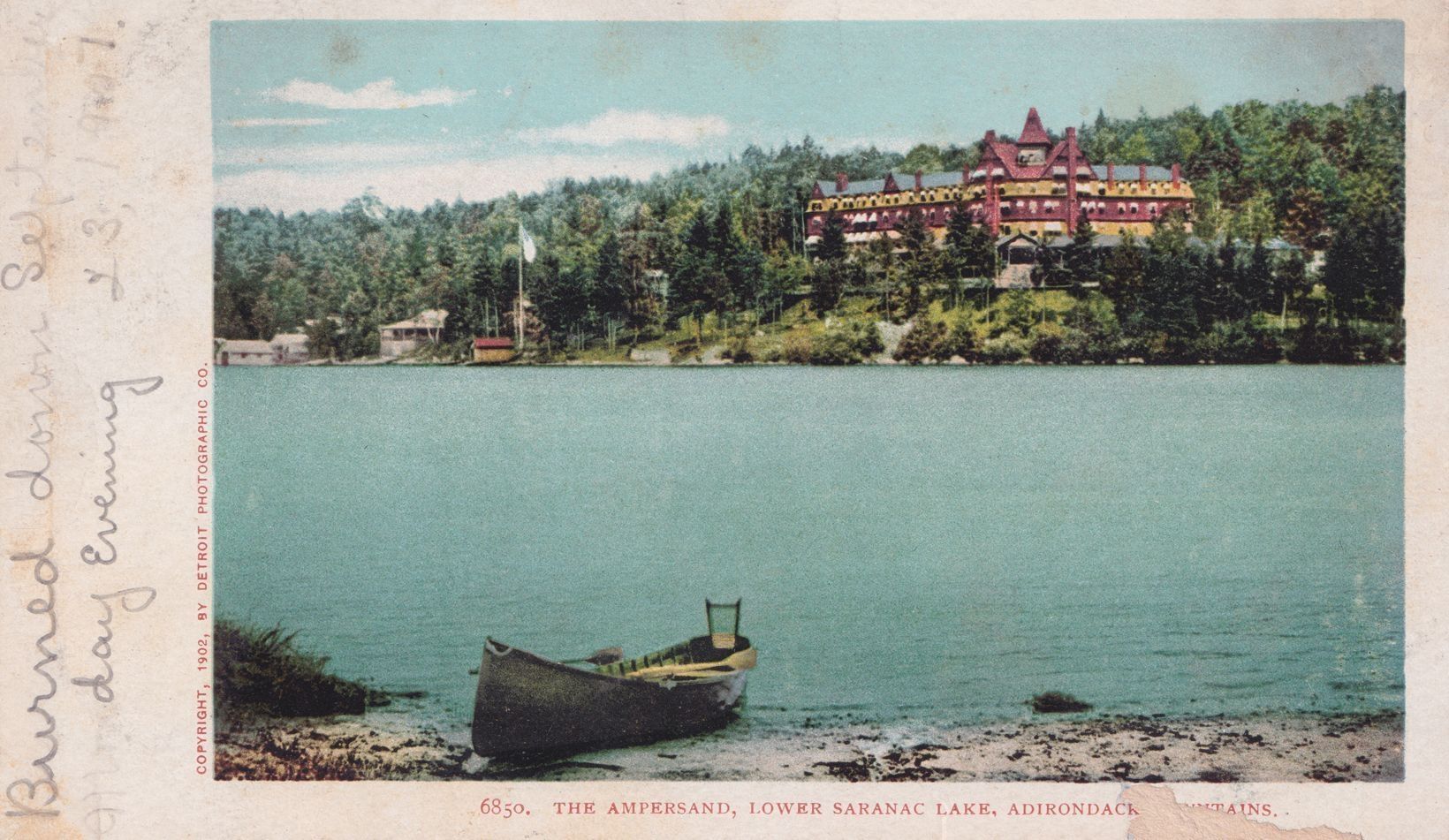 Color postcard of the Ampersand Hotel, seen from the opposite bank of Lower Saranac Lake. There is a boat on the shoreline. "The Ampersand, Lower Saranac Lake, Adirondack Mountains" is printed in red ink along the bottom of the image. "Burned down Monday Evening September 23, 1907" is written along the edge of the postcard, to the side of the image.Subject Place
