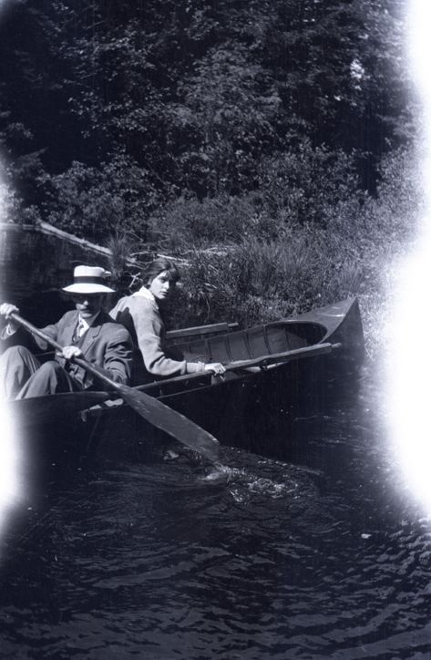 Negative of an man and woman in a canoe on the edge of a lake. The man is likely either Dr. Edward Baldwin or his brother, Ernest Baldwin. There is a wall of trees behind them. Most likely taken by Mary Ives Baldwin. This item is not fully cataloged but has been uploaded so the image is publicly available; if you would like us to prioritize cataloging this item, please contact the HSL Collections team.