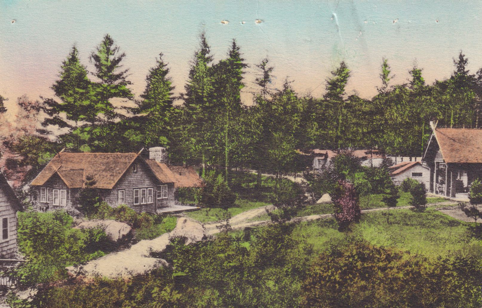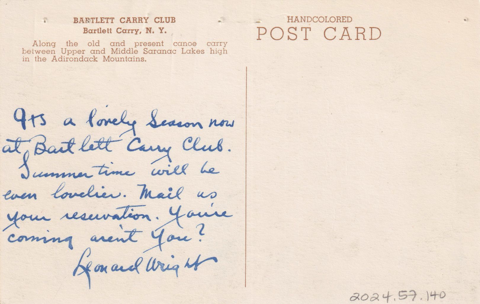 Color postcard showing several buildings at Bartlett Carry Club. Printed caption on reverse reads, "Bartlett Carry Club." No printer's mark. Used, divided back, not postmarked. Handwritten note on reverse reads, "It's a lovely season now at Bartlett Carry Club. Summertime will be even lovelier. Mail us your reservation. You're coming aren't you? Leonard Wright."Subject Place
