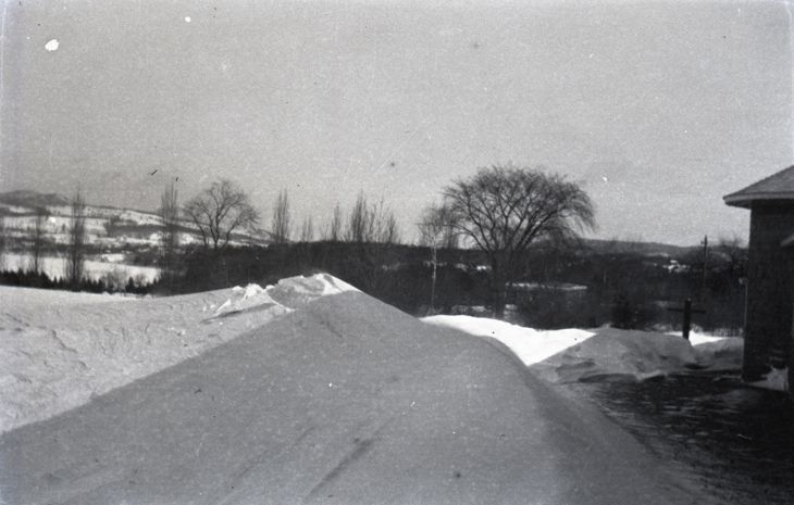 Negative of a snow-covered backyard, partially in the shadow of the house in front of it. Some of the snow has been cleared from at the right of the image. There are trees and hills in the background. Most likely taken by Mary Ives Baldwin. This item is not fully cataloged but has been uploaded so the image is publicly available; if you would like us to prioritize cataloging this item, please contact the HSL Collections team.