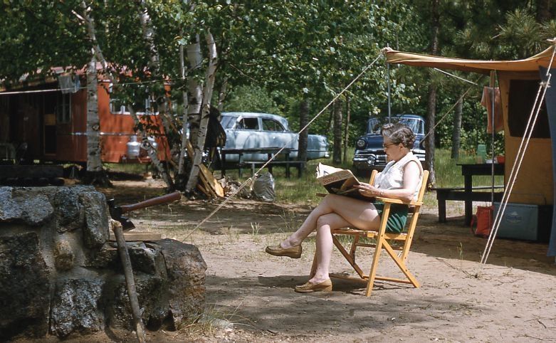 Color Kodachrome slide showing a woman sitting in a camp chair and reading a book. Dated July 1958. This item is not fully cataloged but has been uploaded so the image is publicly available; if you would like us to prioritize cataloging this item, please contact the HSL Collections team.