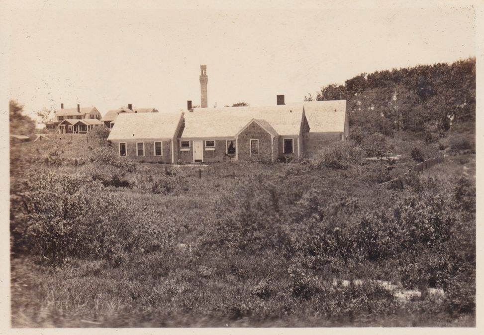 Black-and-White photograph of a small cottage in Provincetown, MA. The Pilgrim Monument can be seen in the distance. The Jones Family took a long road trip in 1934 that ended in Provincetown, where Amy would study with Robert Henrie. After the summer, Blair needed to return to Saranac Lake for his health.