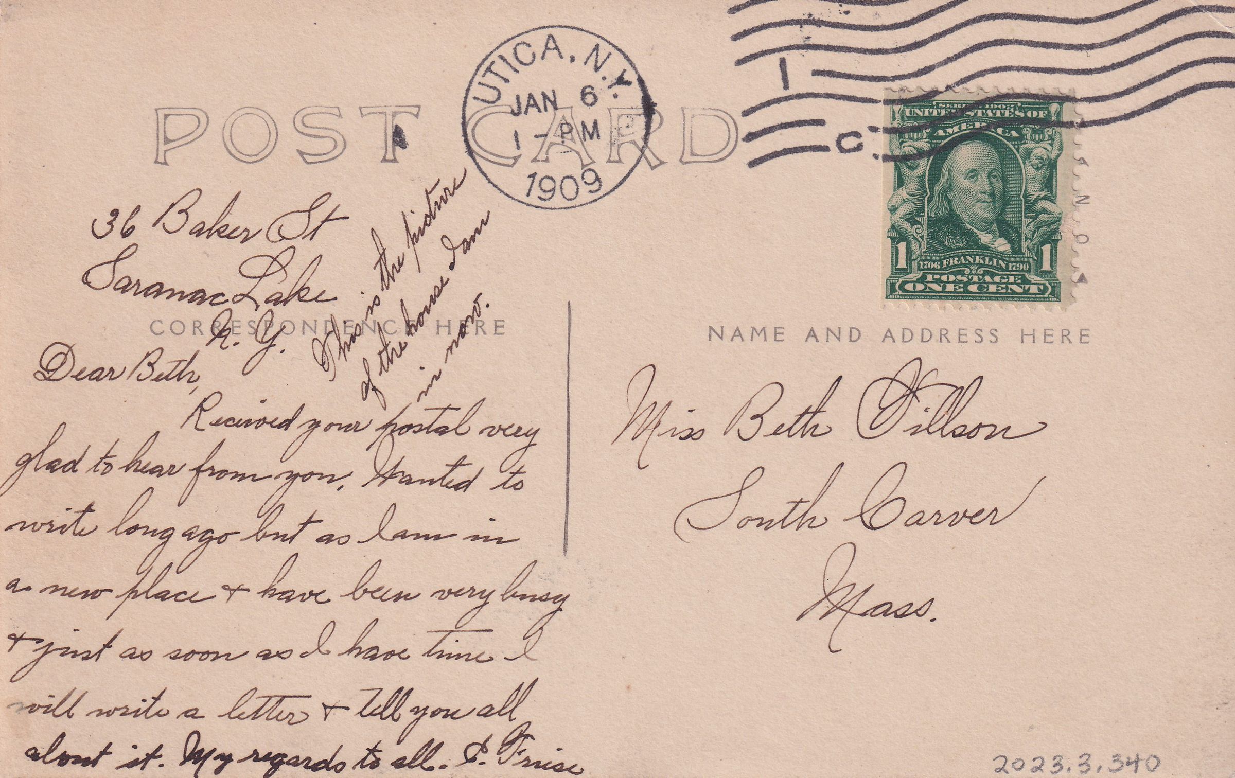 Photograph postcard showing a view of the cure cottage at 36 Baker Street [no longer standing, now a different house at 73 Baker Street.]. No photographer's mark. Used, divided back, postmarked Utica, N. Y., January 6, 1909. Handwritten message on back reads, "36 Baker St., Saranac Lake, N. Y. Dear Beth, this is a picture of the house I am in now. Received your postal very glad to hear from you. Wanted to write long ago but as I am in a new place & have been very busy & just as soon as I have time I will write a letter & tell you all about it. My regards to all. [?] Frise." Mailed to Miss Beth Wilson, South Carver, Mass.Subject Place