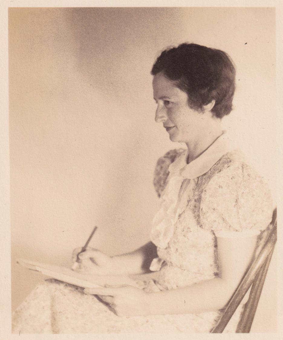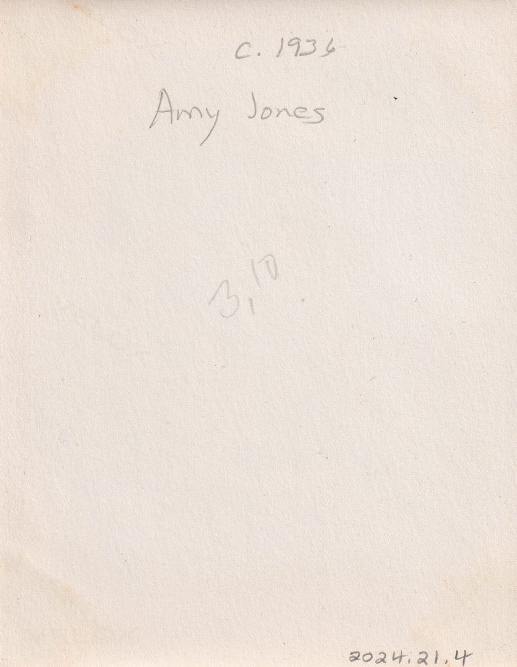 Black-and-White photograph of Amy Jones in profile. She is holding a notepad and pencil on her lap. Handwritten caption on back reads, "c. 1936. Amy Jones."
