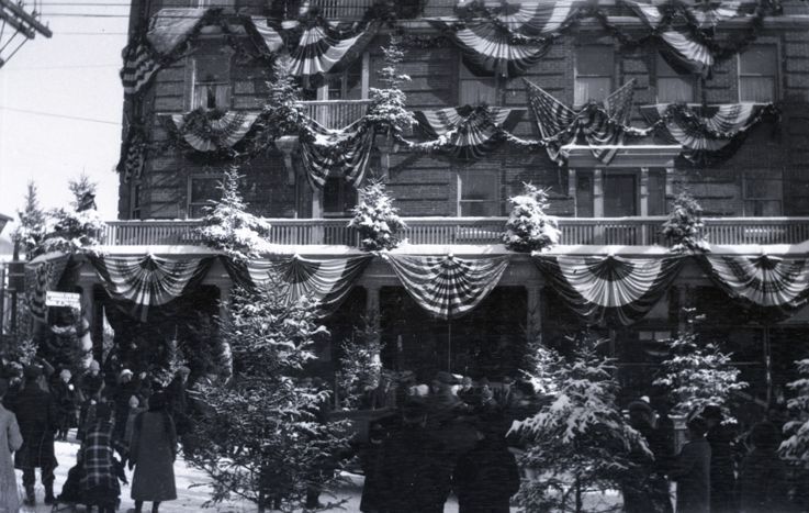 Negative of a building with bunting and American flags decorating the facade. Most likely taken by Mary Ives Baldwin. This item is not fully cataloged but has been uploaded so the image is publicly available; if you would like us to prioritize cataloging this item, please contact the HSL Collections team.