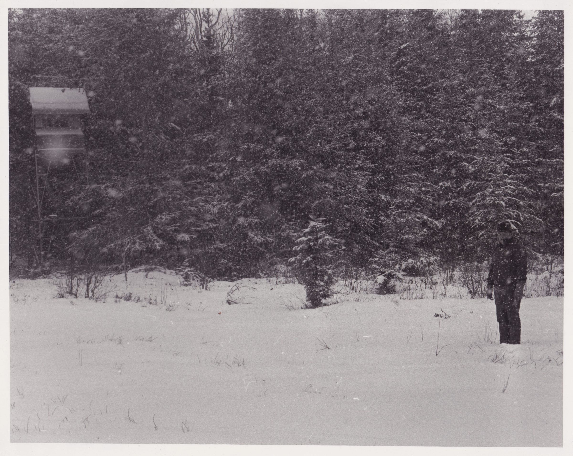 Black-and-White photograph of a man in a game warden uniform standing in the snow. A hunting blind can be seen through the trees. Handwritten note on back reads, "#5 11/17/83. F5.6, 1/250, 1:03PM, Facing south. F8 @ 7 1/2 sec.Lexicon