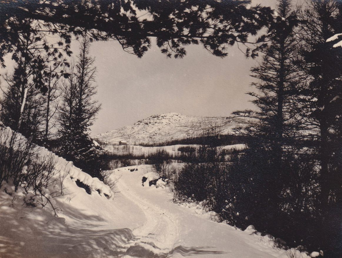 Black-and-White photograph of an unidentified road in wintertime. A mountain can be seen in the distance. The photograph was likely printed by Kollecker's Kodak and Gift Shop.