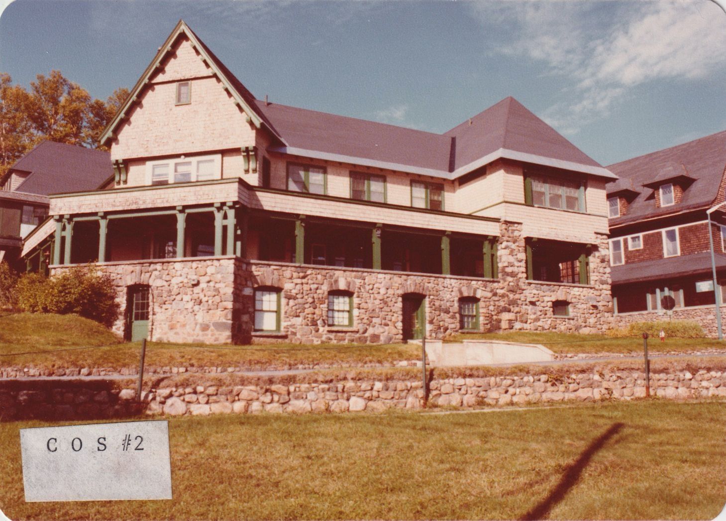 Color photograph of the Sheldon and Albert Medical & Reception Pavilion at Trudeau Sanatorium, taken when the grounds were owned and used by the American Management Association. At that time, this building was known as the Customer Services Building #2. There is a label affixed to the front of the photograph that has "COS #2" typewritten on it.