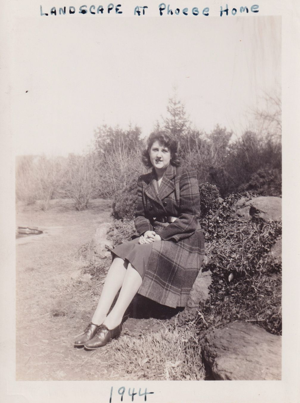 Black-and-White photograph of an unidentified tuberculosis patient [possibly Dot] seated on the grounds at "Phoebe Home." Handwritten caption on front reads, "Landscape at Phoebe Home, 1944."