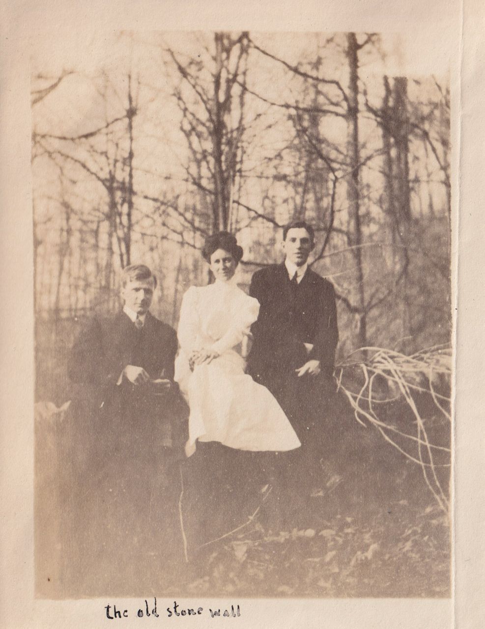 Black-and-white photograph of a woman and two men sitting on a stone wall next to wooded area. "The old stone wall" is written in ink beneath the photograph.