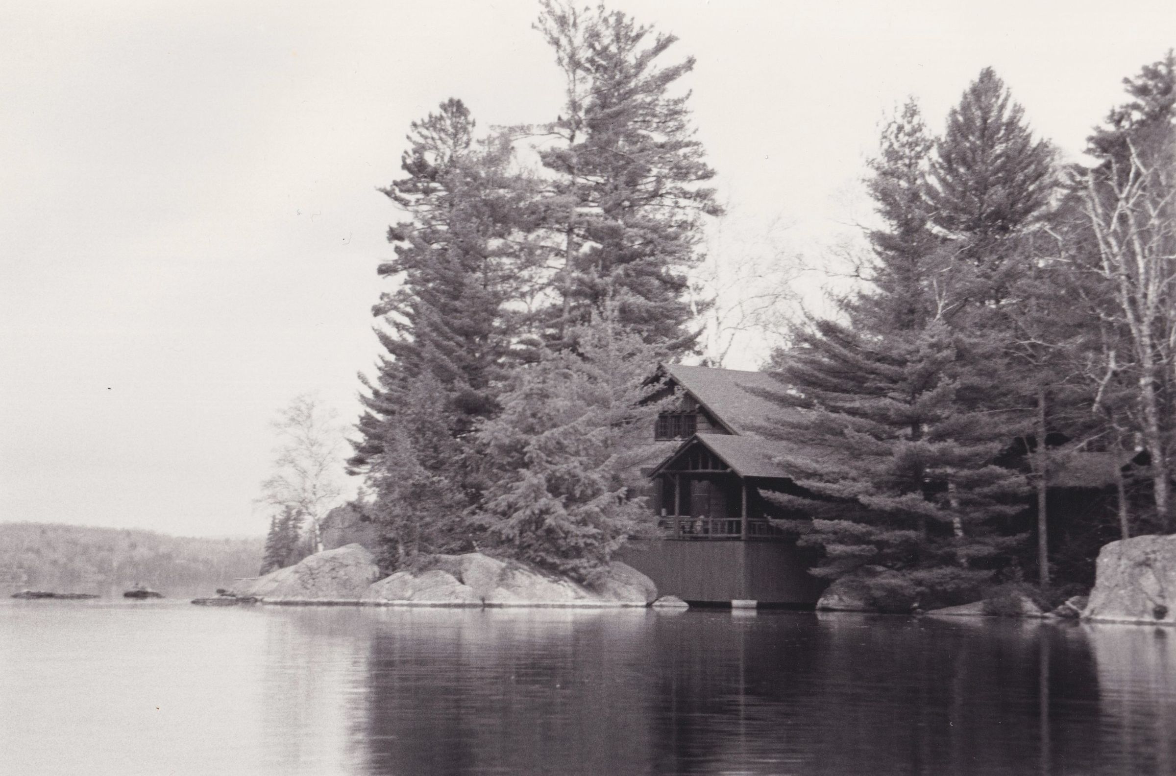 Black-and-White photograph of an unidentified cottage at Bartlett Carry Club, seen from the water's edge.