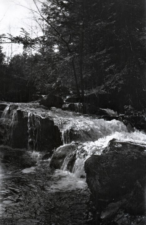 Negative of water flowing over rocks and into rapids in a forest. Most likely taken by Mary Ives Baldwin. This item is not fully cataloged but has been uploaded so the image is publicly available; if you would like us to prioritize cataloging this item, please contact the HSL Collections team.