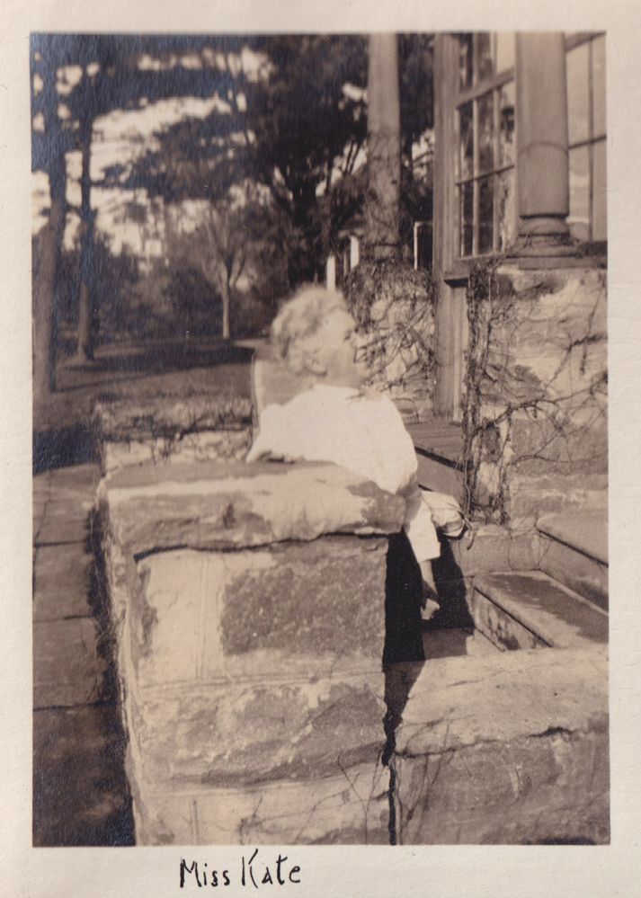 Black-and-white photograph of an older woman standing on the stone steps leading up to a house, looking at something to her left. "Miss Kate" is written in ink beneath the photograph.