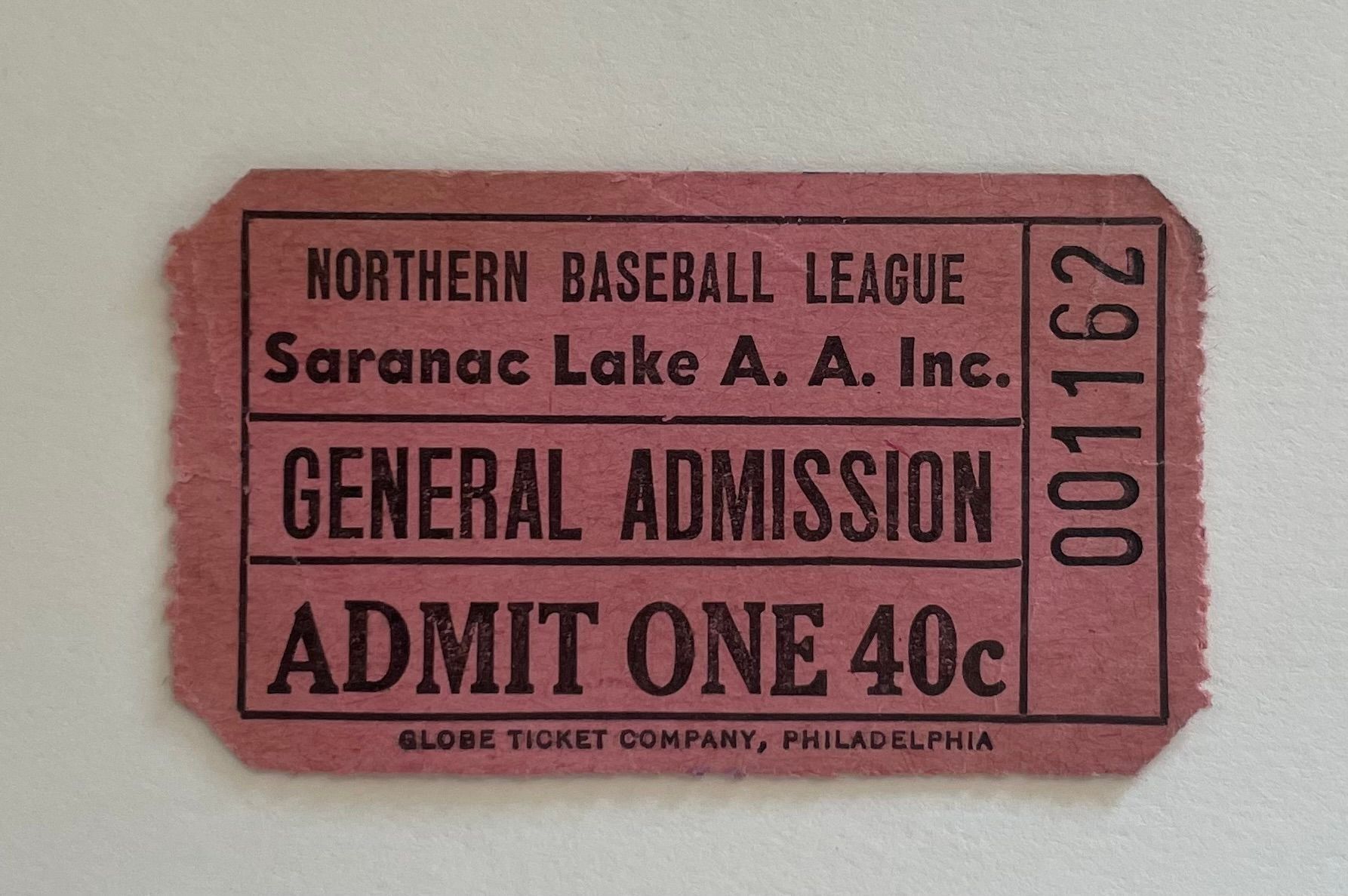 Admission ticket for the Northern Baseball League, Saranac Lake A. A. Inc. General admission, 40 cents.Collection