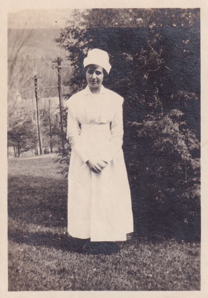 Black and white photograph of a nurse standing outside in front of a large tree. She is standing on a hill, with a road going downhill visible behind her and tree.