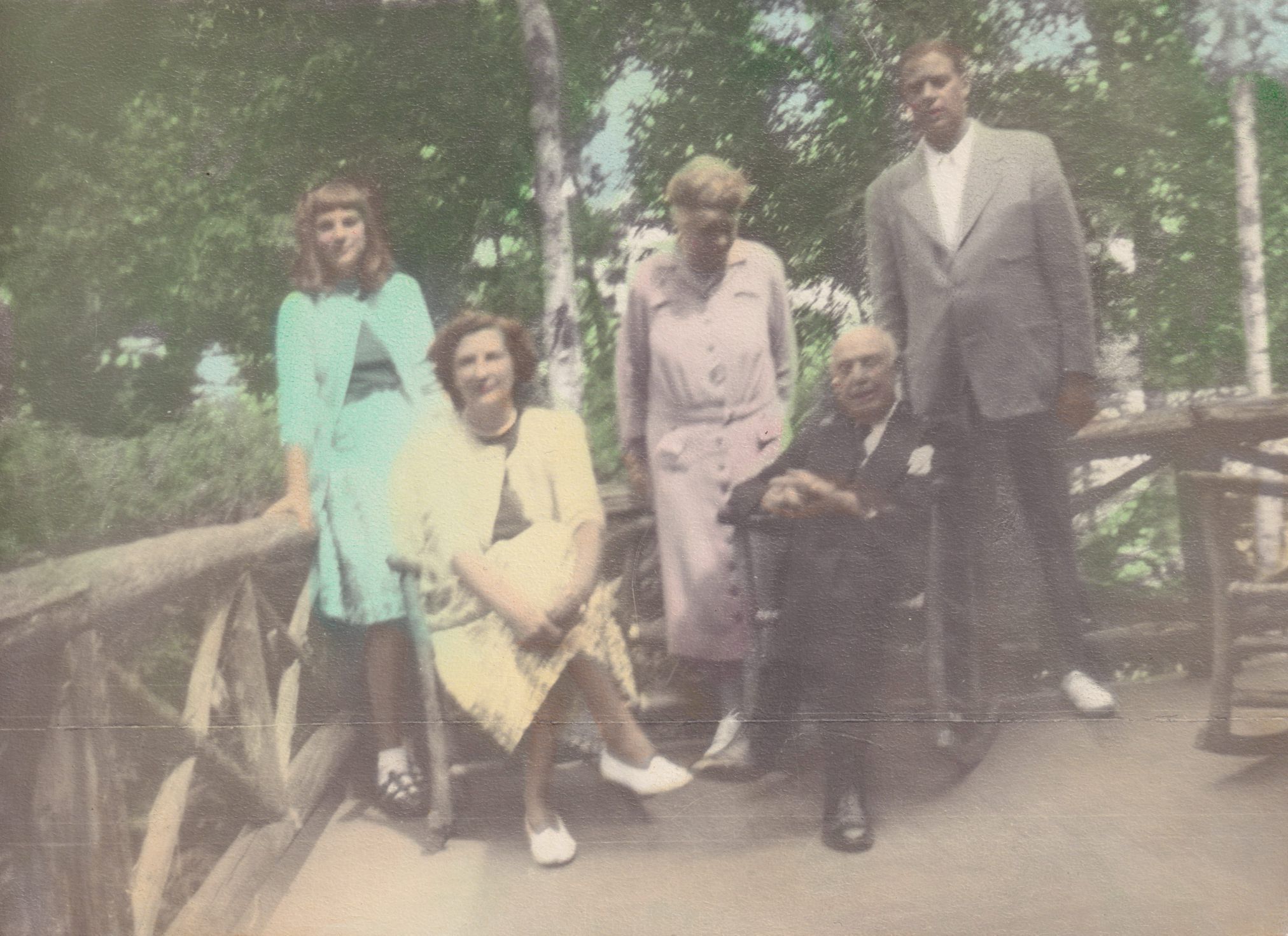 Hand-colored photograph of members of the Yardley Family on a porch at Bartlett Carry Club. From left, standing: Pamela Yardley, unidentified, unidentified. Seated: unidentified, Farnham Yardley. Handwritten note on reverse reads, "Camp Waubenoo, August 1948."Photograph Details