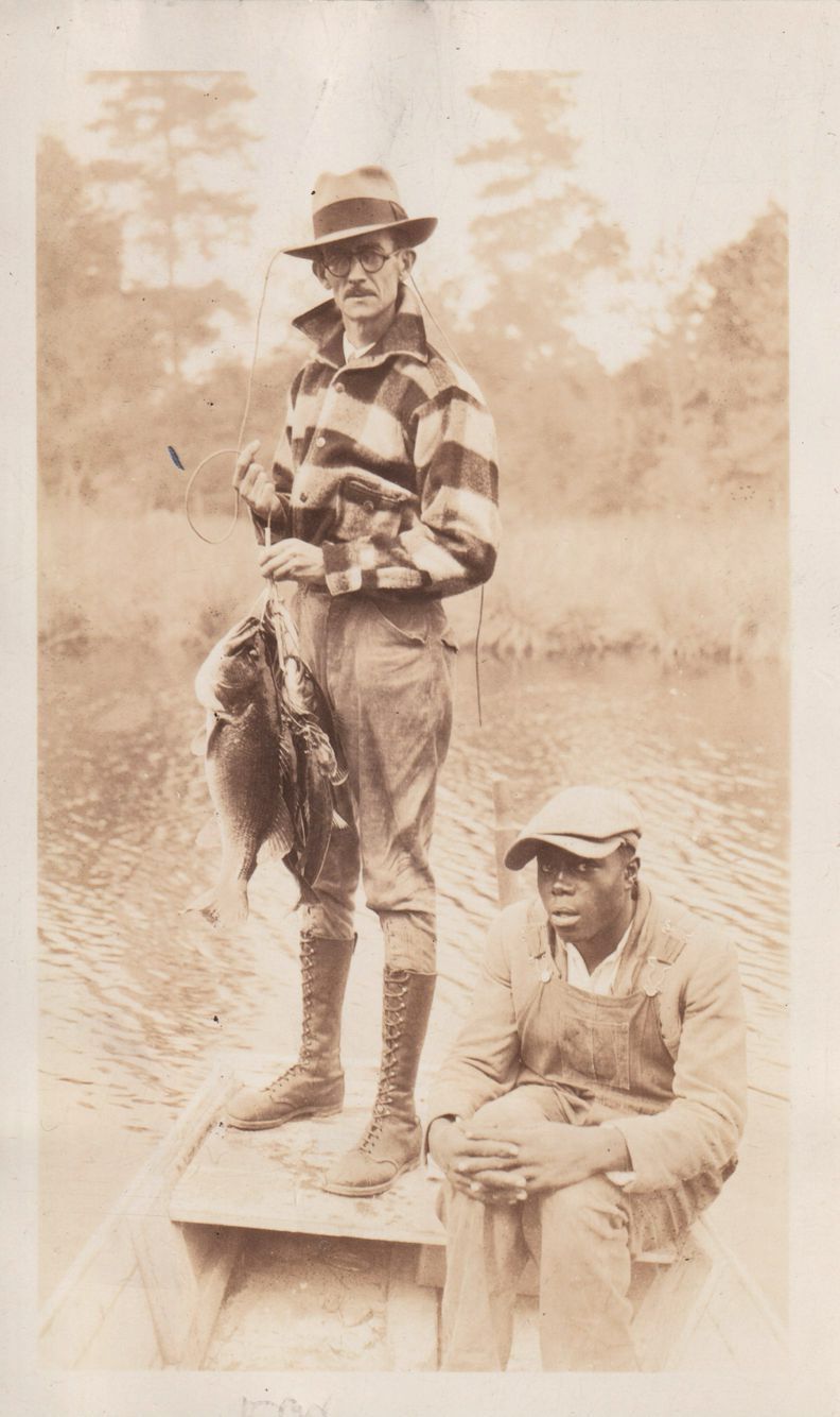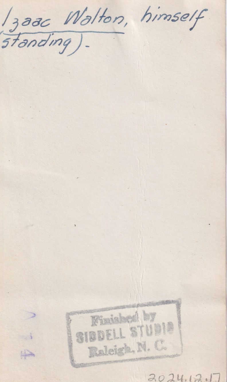 Photograph of Isaac Walton holding fish on a dock with another man seated.