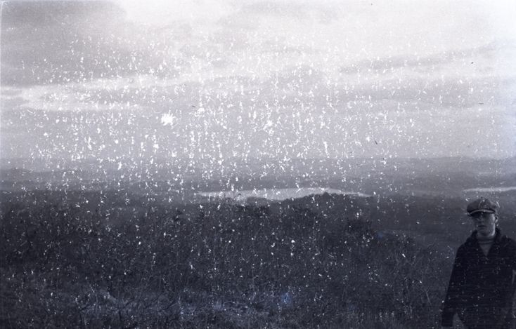 Negative of an unidentified young man standing in front of the view from a mountain top or similar place of high elevation. Parts of the image are obscured by bits of paper stuck to the surface of the negative. Most likely taken by Mary Ives Baldwin. This item is not fully cataloged but has been uploaded so the image is publicly available; if you would like us to prioritize cataloging this item, please contact the HSL Collections team.